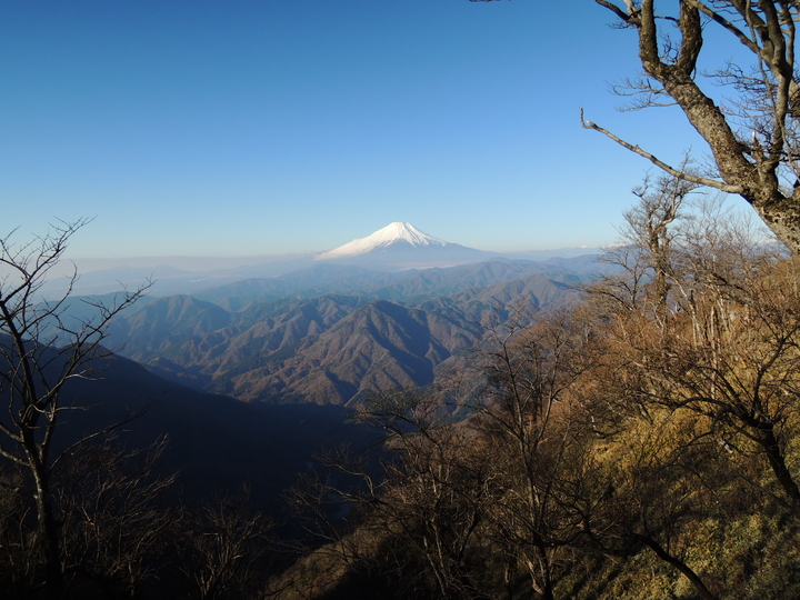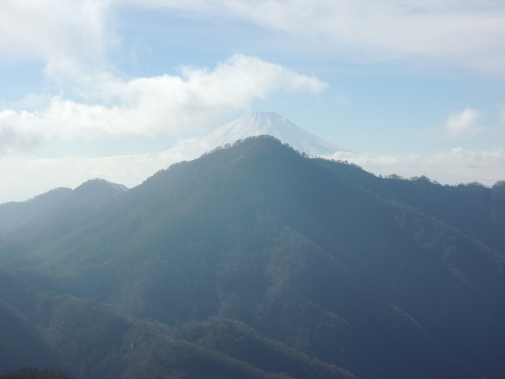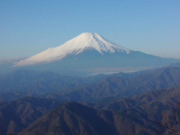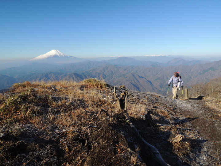 稜線に出ると西側の展望が一気に開けて、壮麗な富士の山容が不意に現れる。まさに「目に飛び込んでくる」という印象。