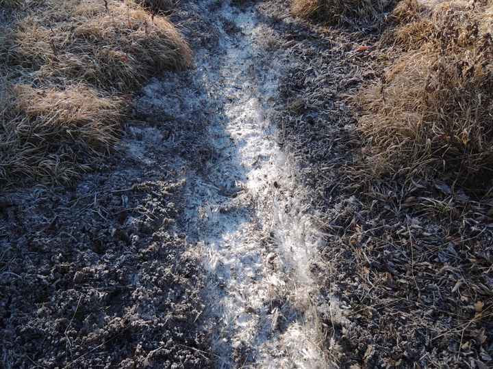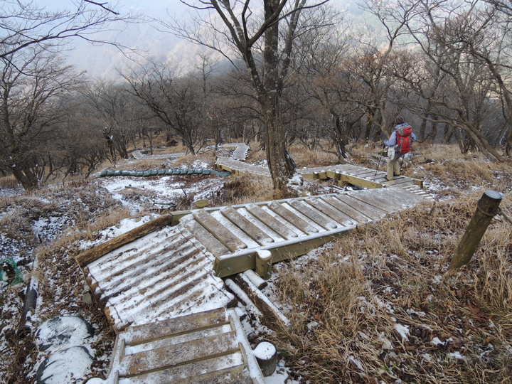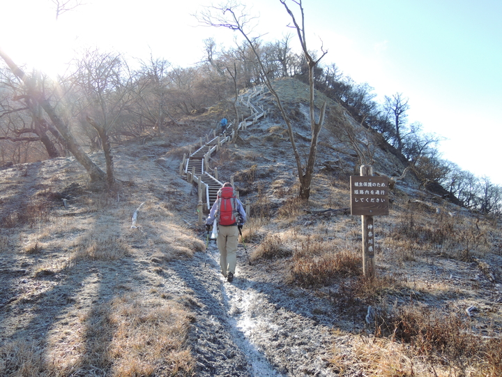 12:45 下山開始。姫次へ向かう北側斜面につけられた木道は、霜で凍りついていた。