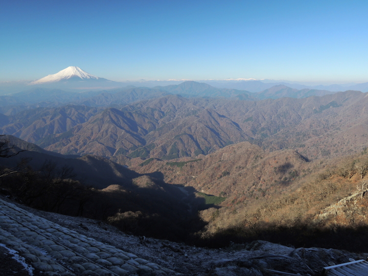 南南東の方角には相模湾。逆光に輝いていたが、真鶴岬も確認できた。右手前の山は同角ノ頭。