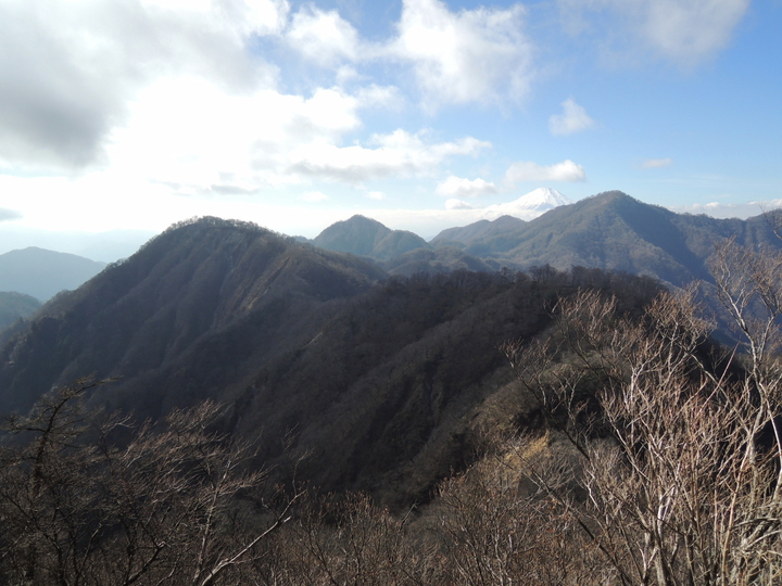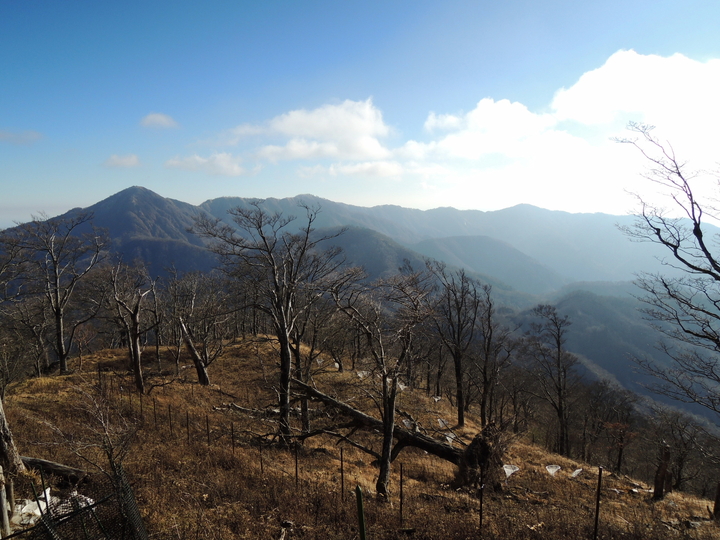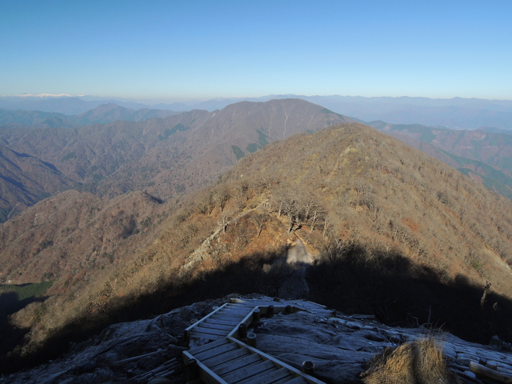 北東方面。左に奥多摩の山並み、右には下りに歩く予定の袖平山から風巻ノ頭へと続く尾根が見える。