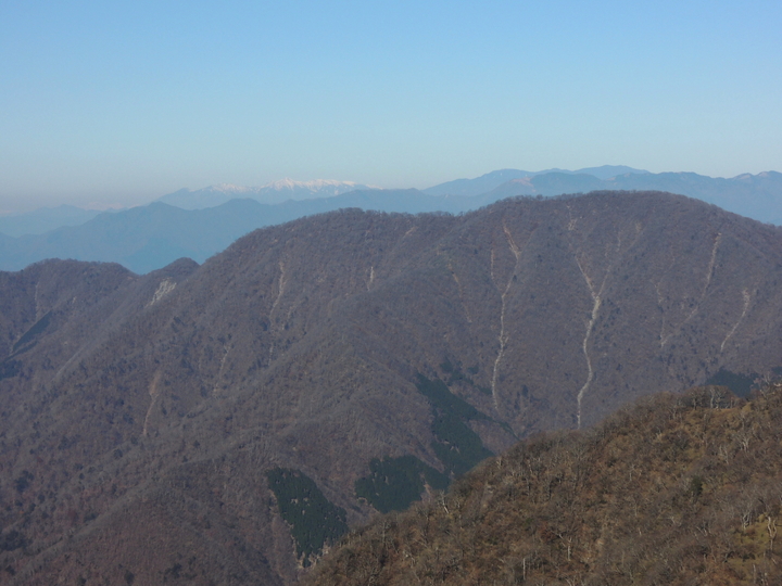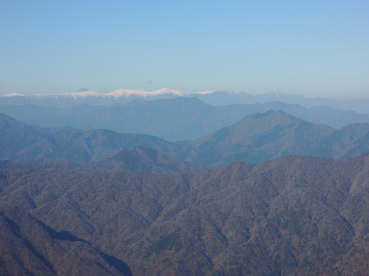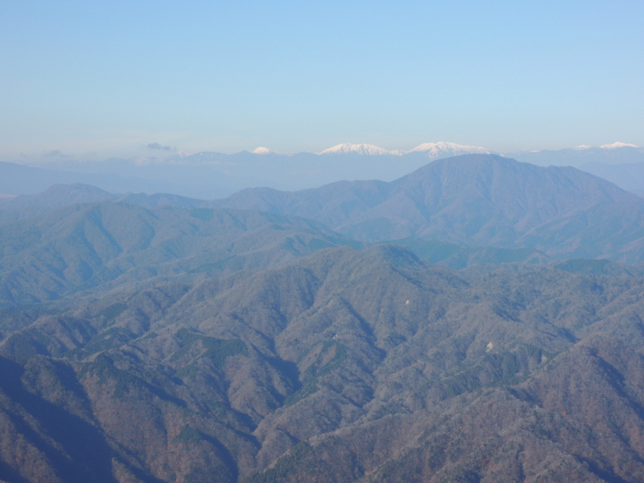 さらに南アルプス。左から塩見岳、農鳥岳、間ノ岳、ほぼ中央に北岳、仙丈ヶ岳、観音岳、右に甲斐駒ケ岳と続く。北岳の右手前は三ツ峠山。