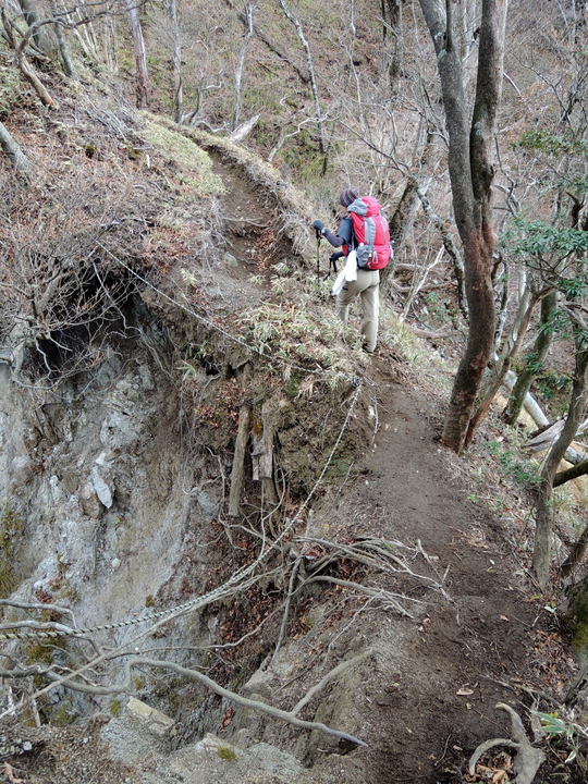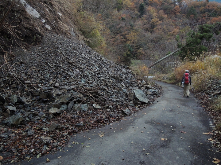 ヤタ尾根の登山口を過ぎて、崩落した土砂の脇を通る。