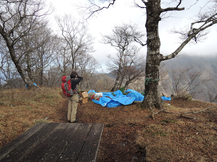 蛭ヶ岳手前のミカゲ沢ノ頭(1,421m)を越える。山頂付近で木段工事をしていた。