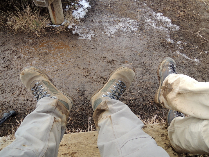登山靴とズボンのすそは泥まみれ。おにぎりを食べて、温かいコーヒーを飲んだ。