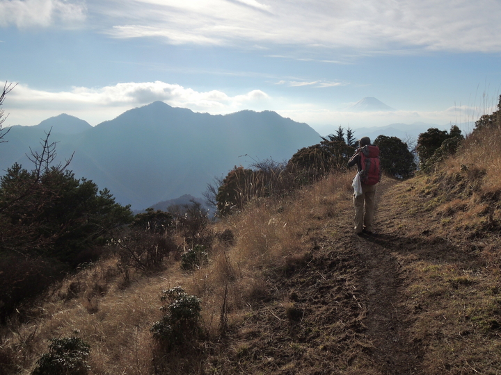 背後を振り返ると、檜洞丸の隣に富士山が並び、歩いてきたく稜線が重なるように一望できた。このあと富士山は、時間とともに雲がかかって見えなくなった。