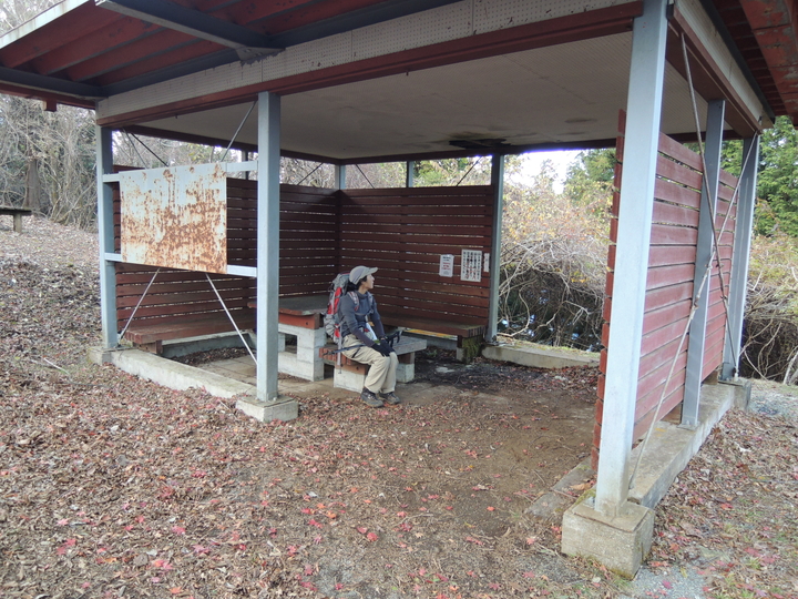 樹林の中で目立たない山頂標。テーブルベンチがいくつかあったので、行動食を摂りながらしばし休憩。