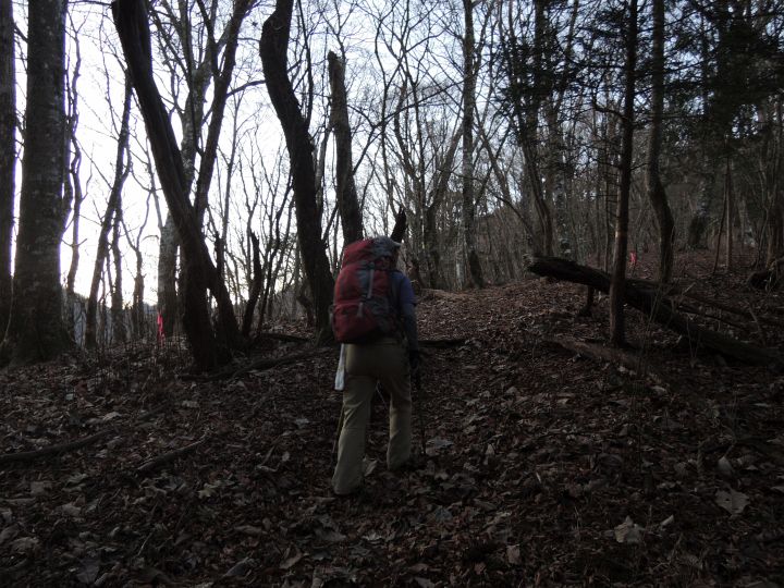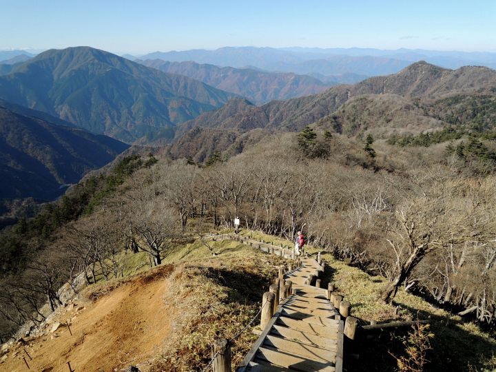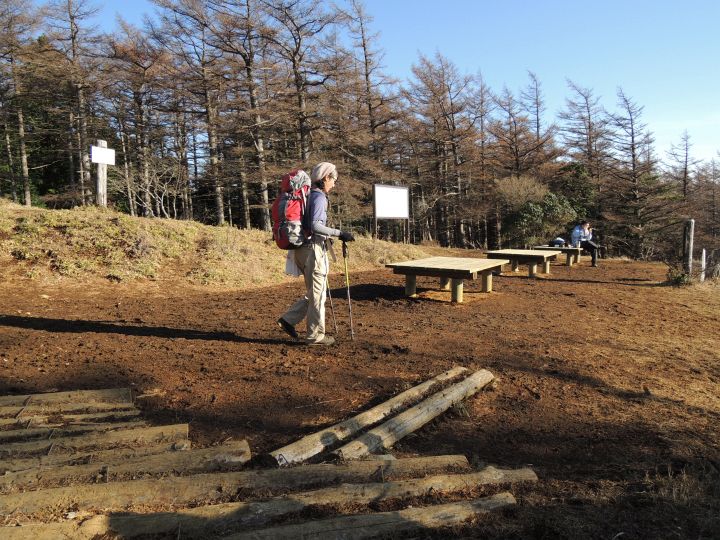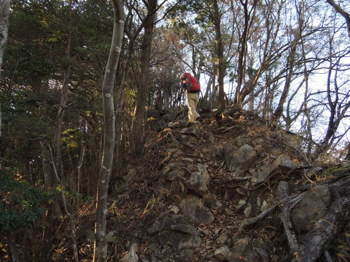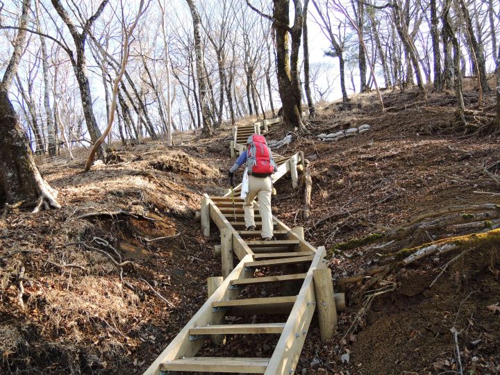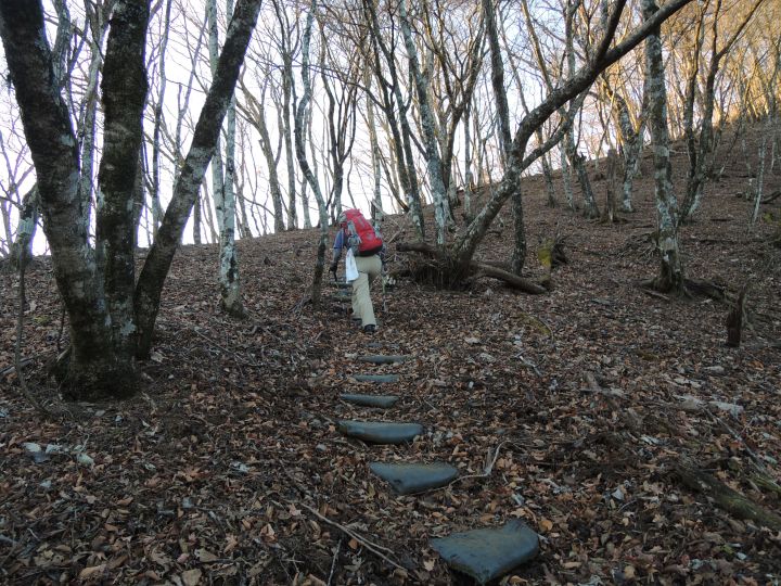 傾斜がゆるくなって開けた尾根に出たが、この後も木段がこれでもかと続いた。