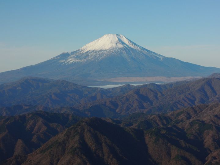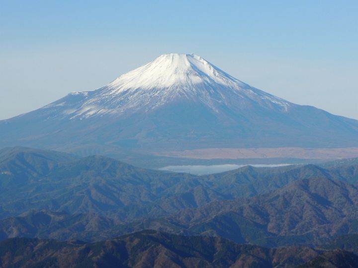 西側には富士山と南アルプスが並ぶ。南アルプスの手前は大室山。