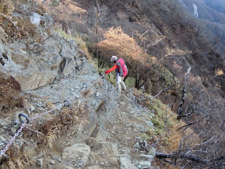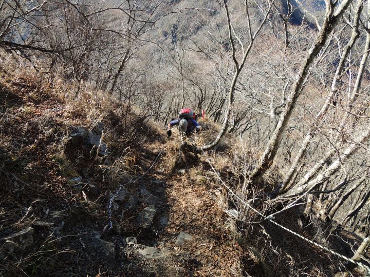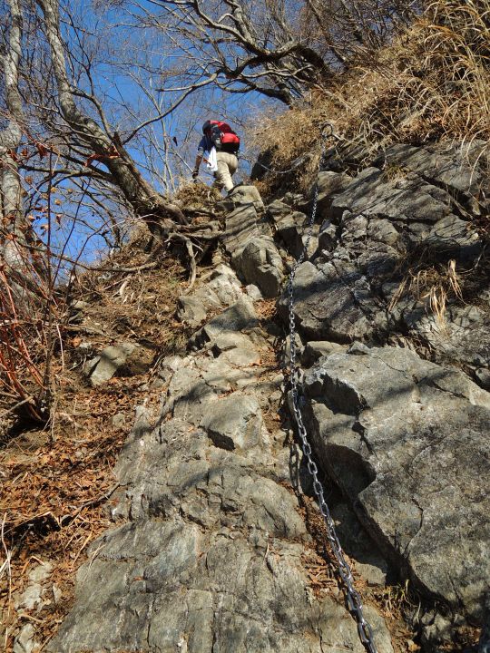 クサリやロープが設置された急登をひたすら上る。途中からノイバラらしき棘とげの灌木帯がしばらく続き、ちくちくと痛かった。