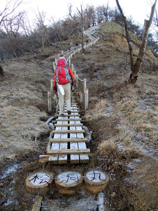 日陰の木段は凍結していたが、横木があるので安心。丹沢の登山道はいつでも手入れが行き届いている。