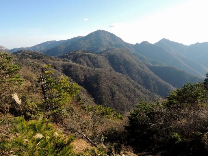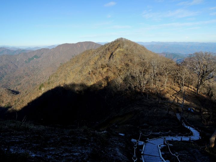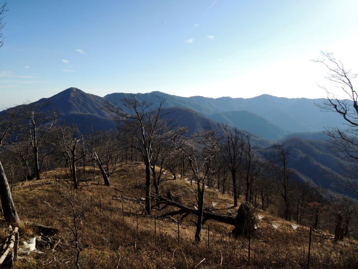 北側の展望を眺めながら下る。左は大室山で、右はこれから向かう袖平山。下山路のある袖平山から左下の風巻ノ頭へ延びる稜線も一望できた。