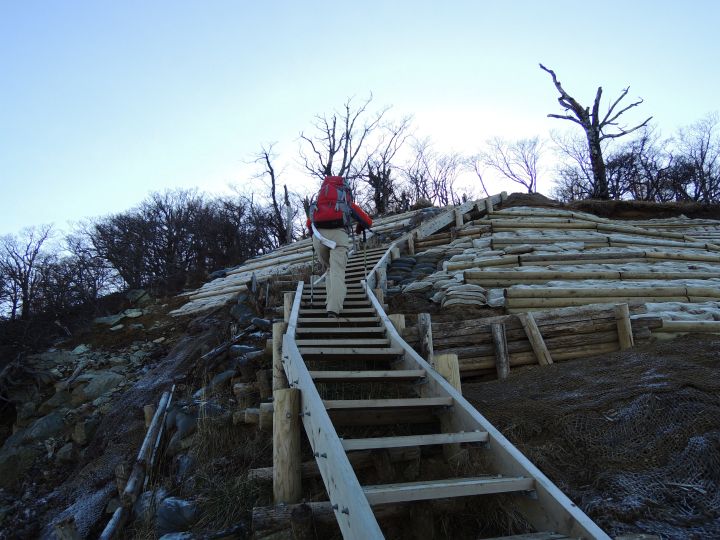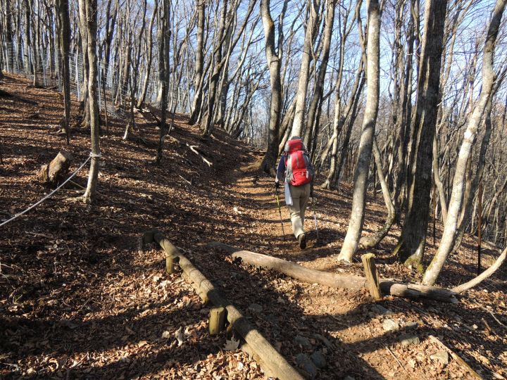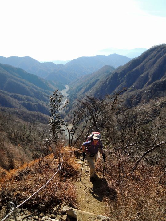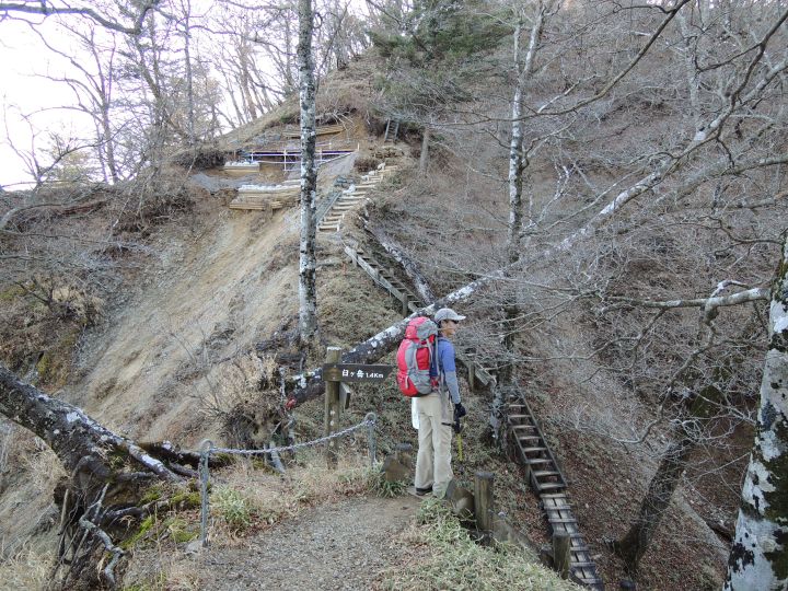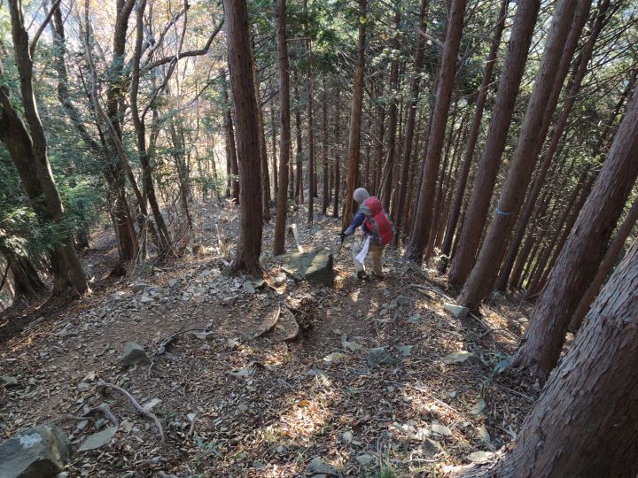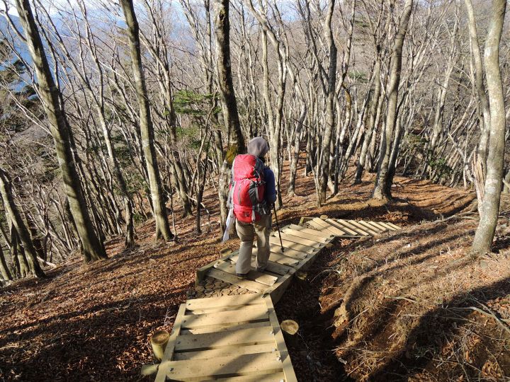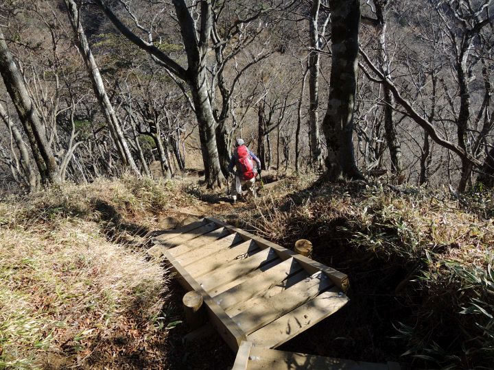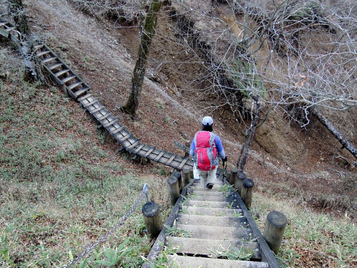 崩落して丸太が浮き出た急坂を下る。かなりの急勾配が続いた。