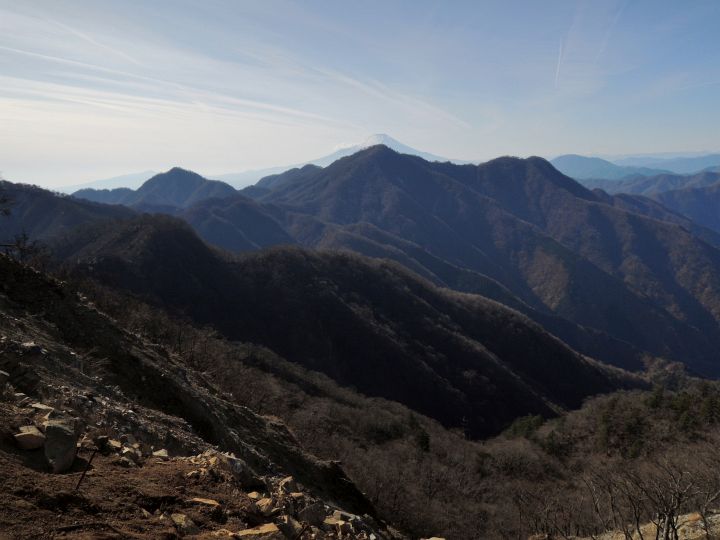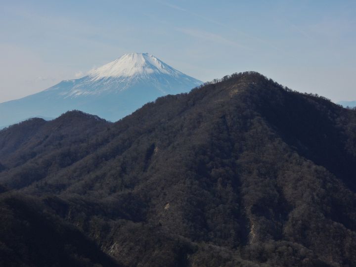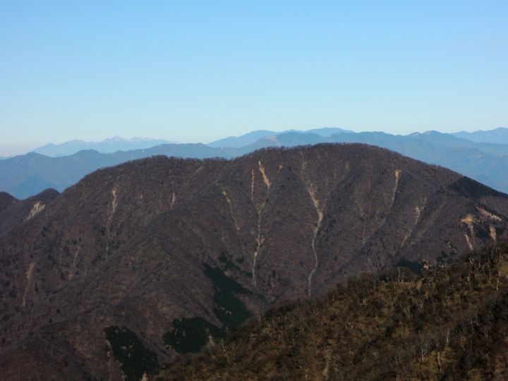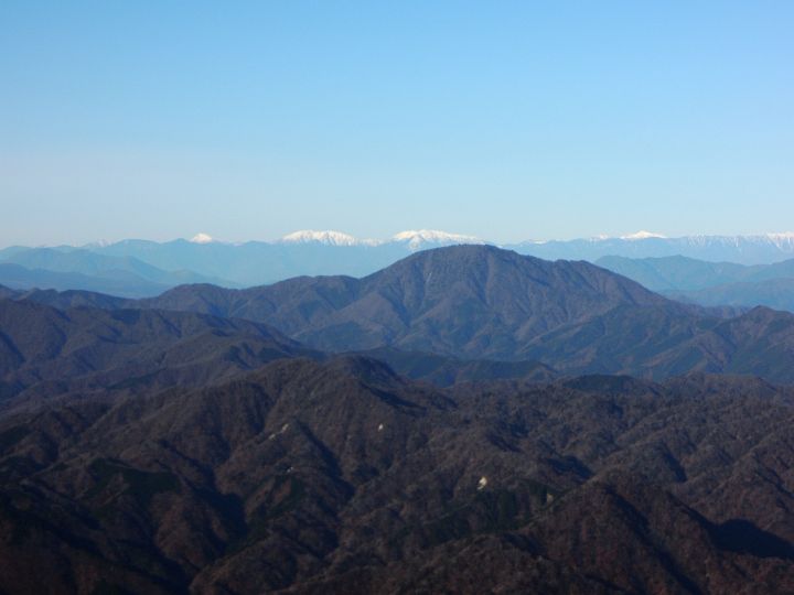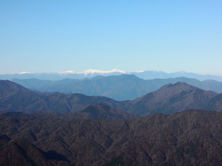 御正体山の奥に見えた南アルプス。左に上河内岳、布引山、聖岳、真ん中あたりに赤石岳と悪沢岳、右に蝙蝠岳と塩見岳。塩見岳の手前は節刀ヶ岳(せっとうがたけ)などの御坂山塊。