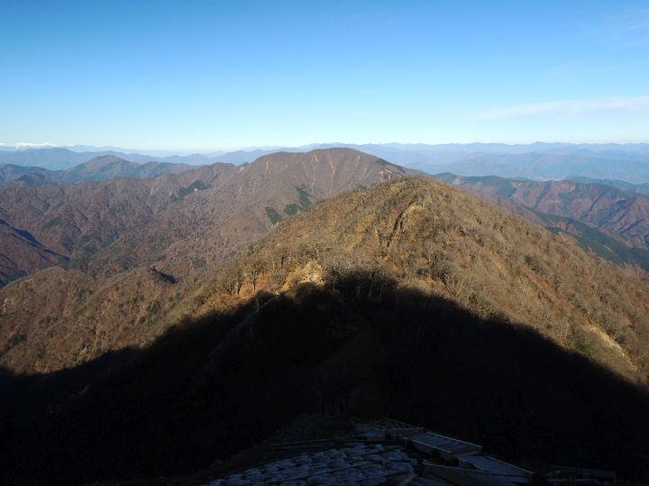 南東方面の眺め。不動ノ峰の左奥に丹沢山、右奥には塔ノ岳から鍋割山まで稜線が延びている。