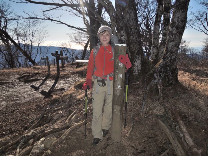 空いていたテーブルにザックを置いて、まずは記念撮影。山頂は風もなくて暖かかった。
