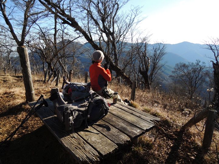 テーブルにザックを置いて小休止。素晴らしい眺めを楽しみながらアンパンを食べた。