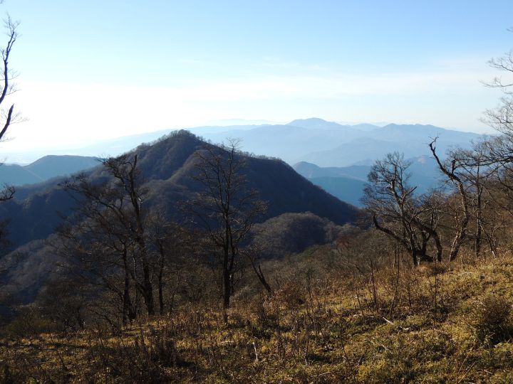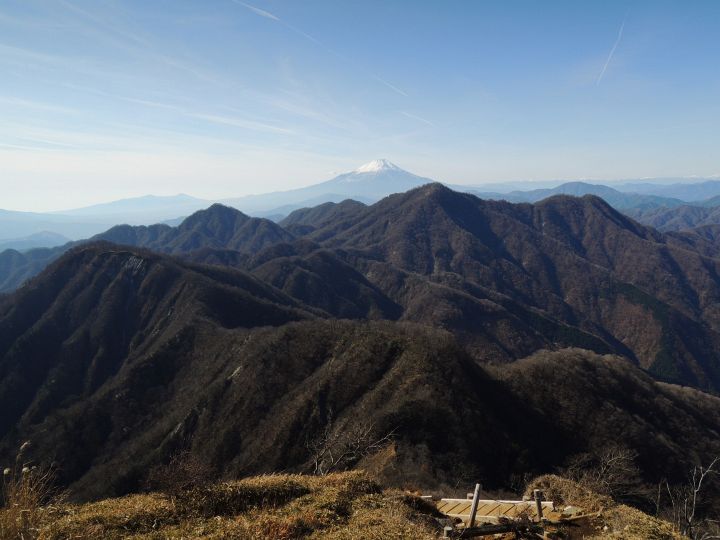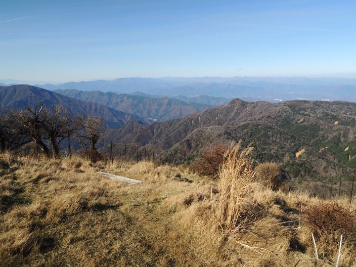 北西側の眺め。熊笹ノ峰の奥に大室山、その後ろには八ヶ岳と奥多摩・奥秩父の山々。