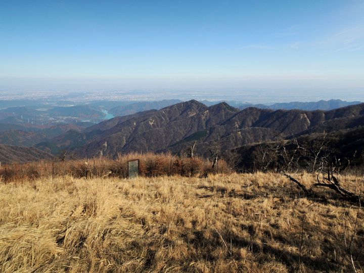 東側の眺め。中央から右へ本間ノ頭、円山木ノ頭、太礼ノ頭と丹沢三峰が並び、本間ノ頭の左は宮ヶ瀬湖。