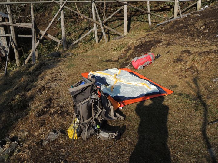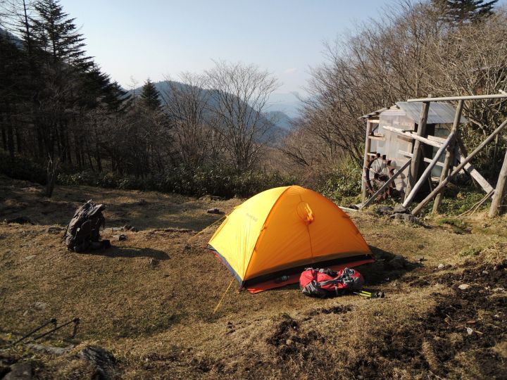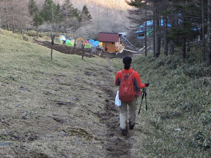 テント場上段は霜の降りた土で、泥濘になることが予想されたため、下段の芝生に幕営した。