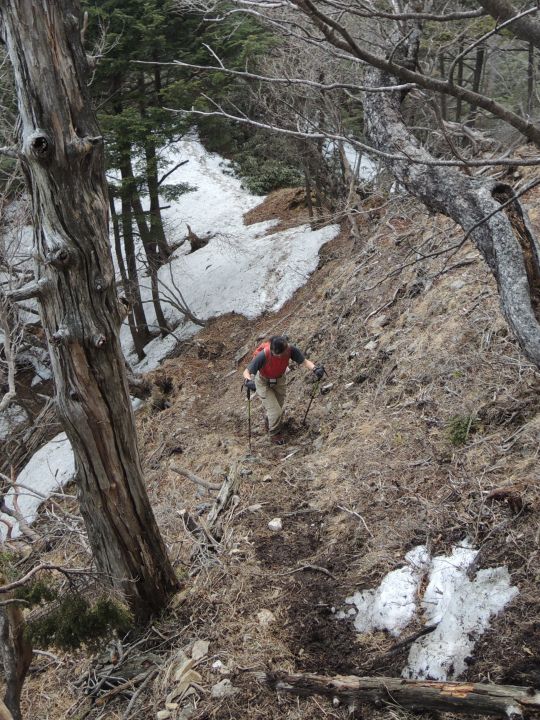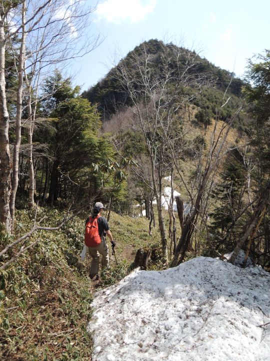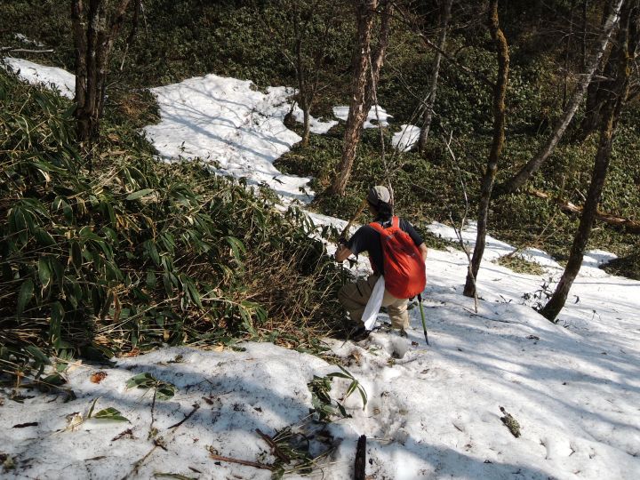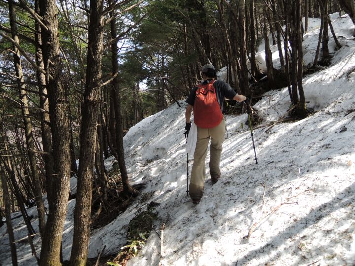 小ピークの北側を巻いて進む。北側の日陰は雪が多かった。
