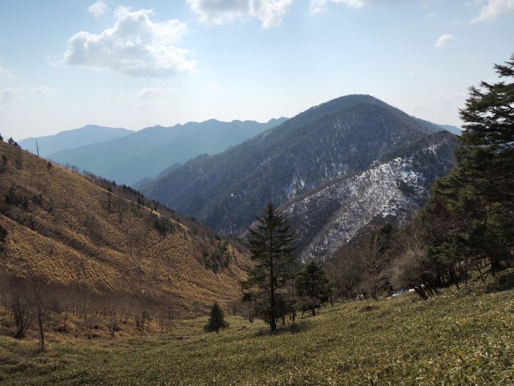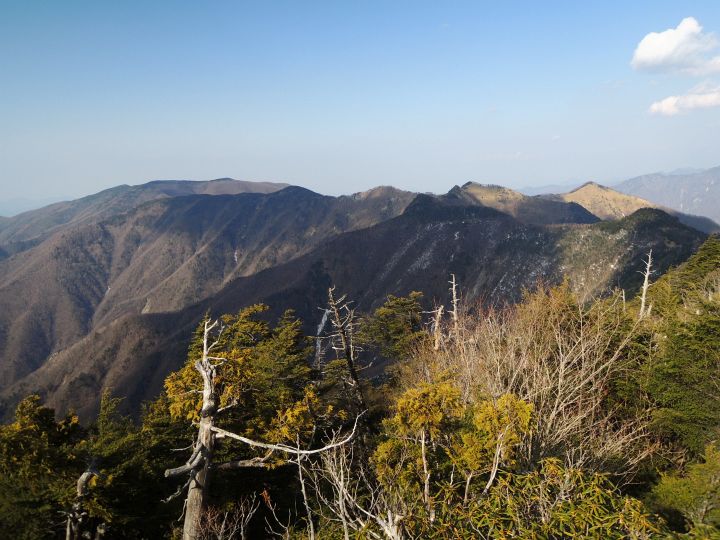 同じく小ピークから見た南側。左は三ツ山から飛龍山へ続く稜線。右には大常木山と竜喰山。2頭の鹿が稜線の下へ逃げていった。後からきた団体は、「時間はぎりぎり」と言いながら和名倉山へ向かっていった。