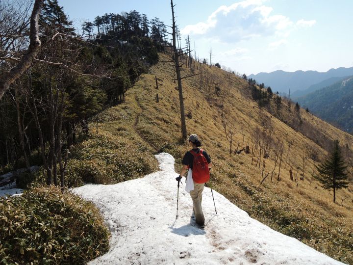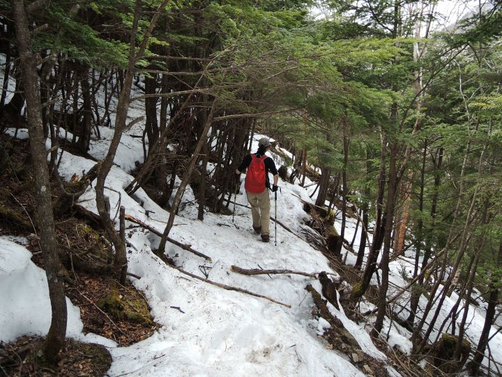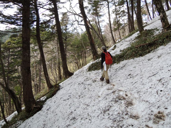 リンノ峰を巻いて進む。雪道歩きの連続で、いつしか登山靴はびしょ濡れになっていた。