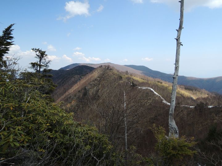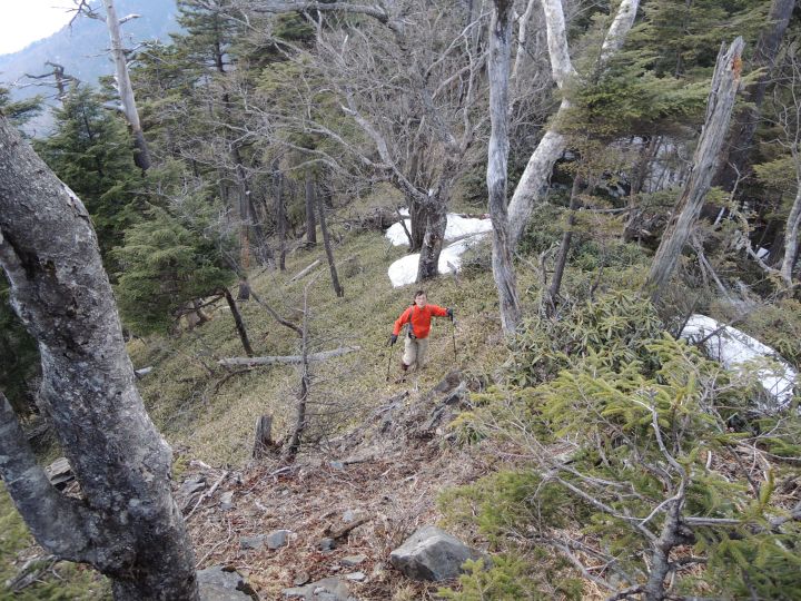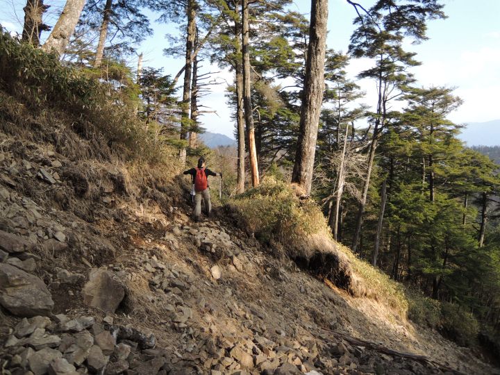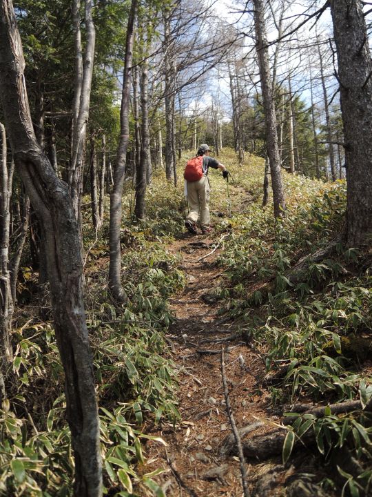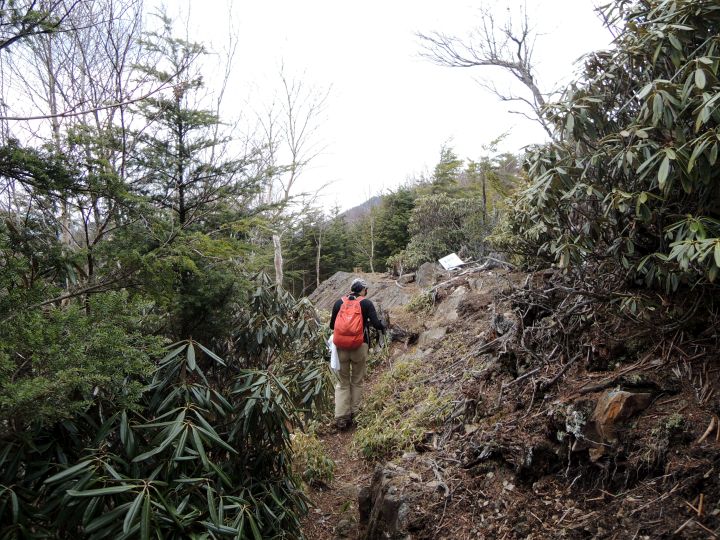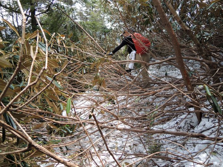 10:10 西仙波に到着。西仙波の前後はシャクナゲの灌木が生い茂って登山道をふさいでおり、進むのが大変だった。5分ほど小休止してから先へ進んだ。