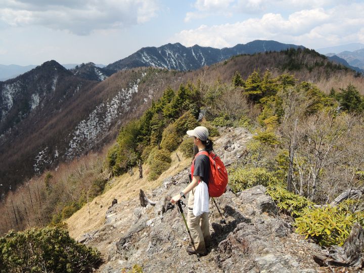 10:55 東仙波に到着。時間的体力的に和名倉山までは難しいと考え、おにぎりを食べてゆっくり休むことにした。西南西の方角には西御殿岩から唐松尾山へ続く稜線が見える。