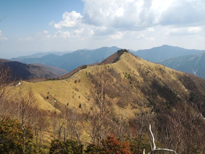 東方面。左手前にカバアノ頭、真ん中奥は白岩山と雲取山。その右には三ツ山と飛龍山。
