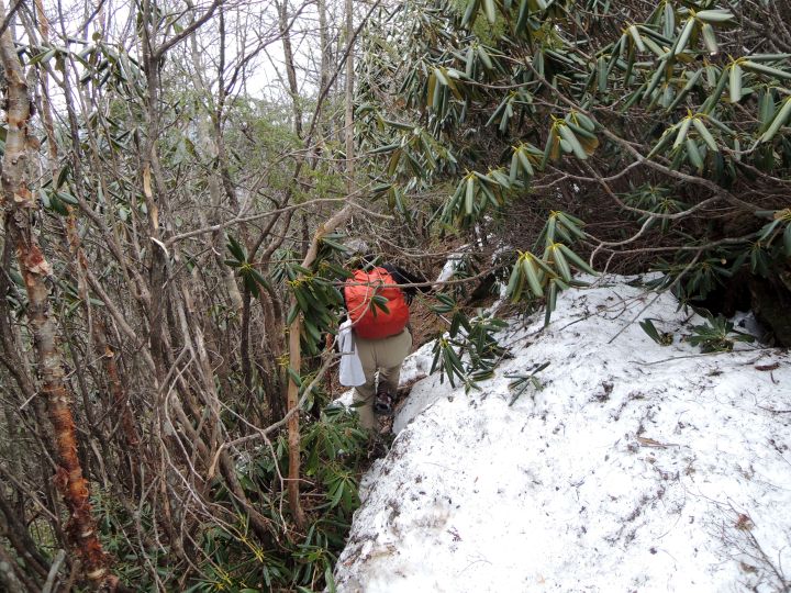 花の季節ならシャクナゲ・ロードとなるところだが、雪でかさ上げされて通れる空間が狭い。