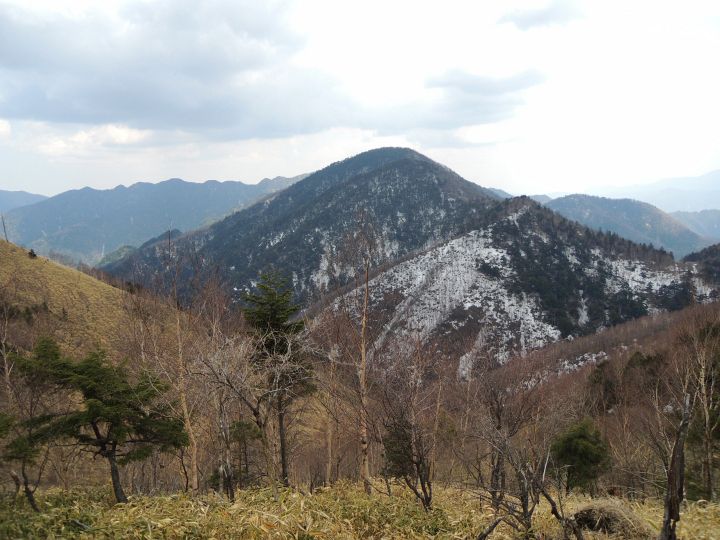 右に大きいのが竜喰山で左奥が雲取山。その間は雲取山から飛龍山へ続く稜線で、三ツ山や北天ノタルなどいくつもの小ピークが連なっている。