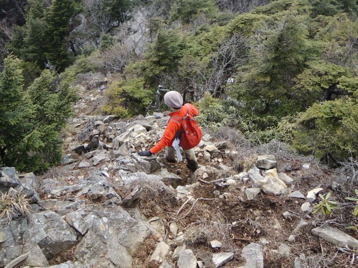 最初は尾根沿いに踏み跡と赤テープが続いていたので正解だったと喜んでいたが、そのうち赤テープがなくなって、踏み跡も怪しくなってきた。比較的歩きやすかった道も、木々や灌木に阻まれて歩きづらくなってきた。嫁は戻ろうと言うが、私は引き返すのが嫌だったので、尾根沿いをどんどん進んだ。しばらく行くと、ピークらしき岩稜に出たので着いたと思ったが、鞍部を挟んでもっと高いピークが前方に現れ愕然とした。時間的にもう着く頃だと思っていただけに、目の前のピークが西御殿岩とは信じがたかった。前方のピーク(西御殿岩)へ向かうには鞍部まで下る必要があるが、見た感じかなり危険な急坂に思えた。一瞬進退窮まったと焦ったが、冷静になってゆっくり下っていくと、右下の斜面に一般ルートの赤リボンが見えて、うまく一般ルートに合流できた。時間にすると数分のことだが、本当に長く感じた。一般ルートを外れるリスクを犯すなら、すくなくとも2万5千分の1の地形図くらいは持参していなければダメだと反省した。