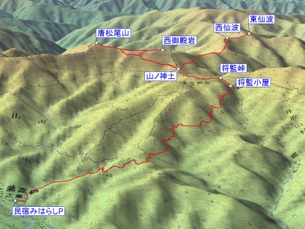 民宿みはらしP 5:00 ⇒ 7:05 将監小屋テント場 8:00 ⇒ 将監峠 8:10 ⇒ 山ノ神土(やまのかんど) 8:30 ⇒ 10:10 西仙波 10:15 ⇒ (露岩で10分休憩) ⇒ 10:55 東仙波 11:30 ⇒ (露岩で5分休憩) ⇒ 西仙波 12:00 ⇒ 山ノ神土 13:15 ⇒ 14:25 唐松尾山 14:35 ⇒ 15:20 西御殿岩 15:55 ⇒ 山ノ神土 16:35 ⇒ 将監峠 16:50 ⇒ 将監小屋テント場 16:55