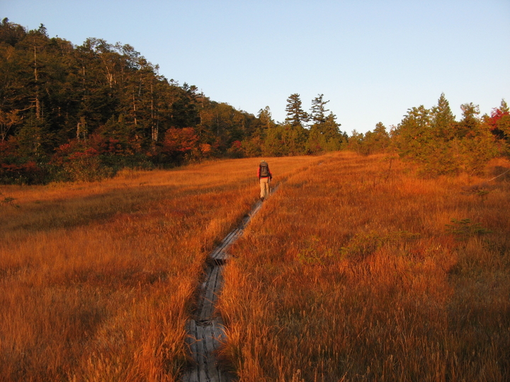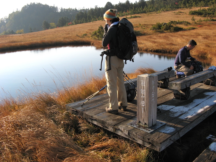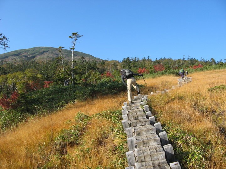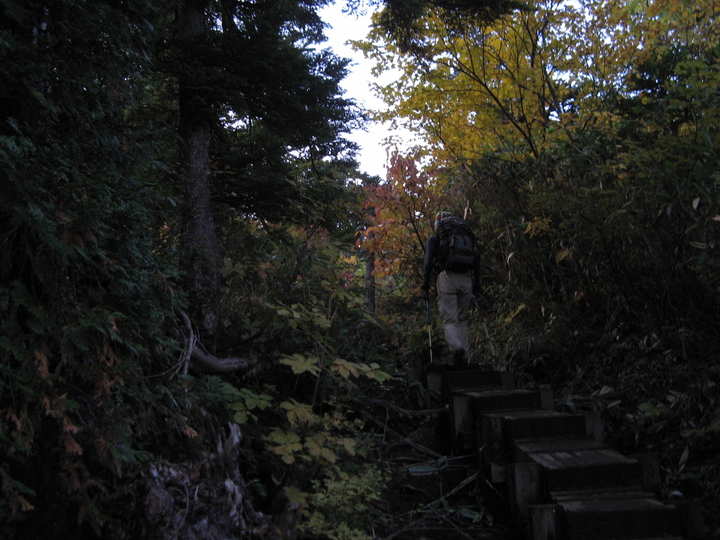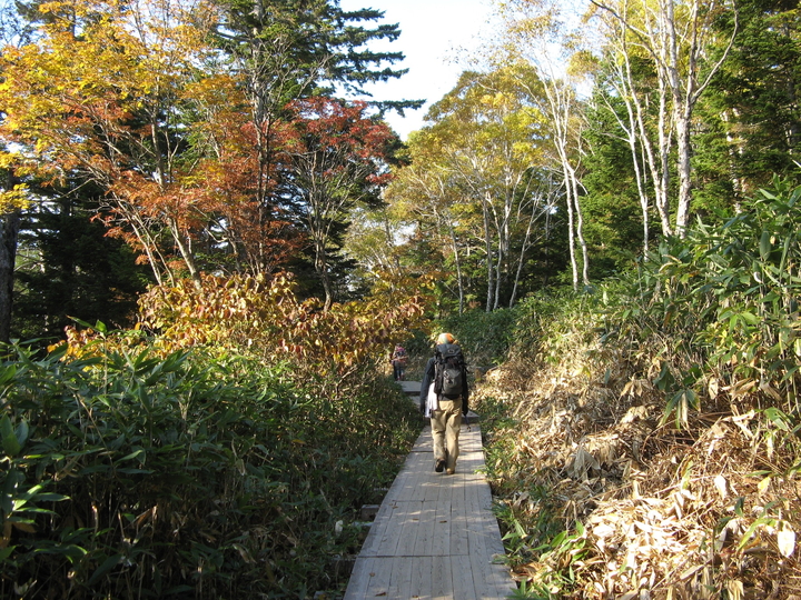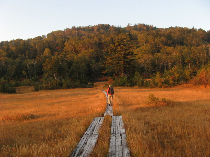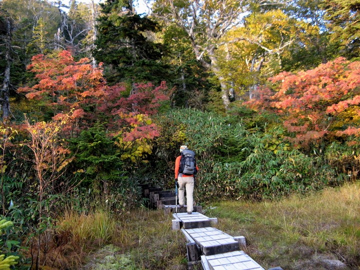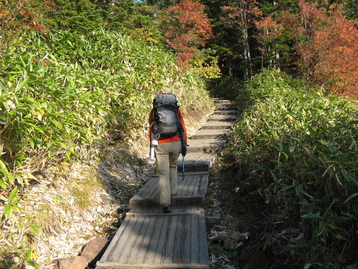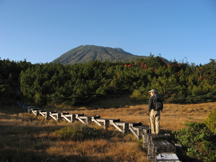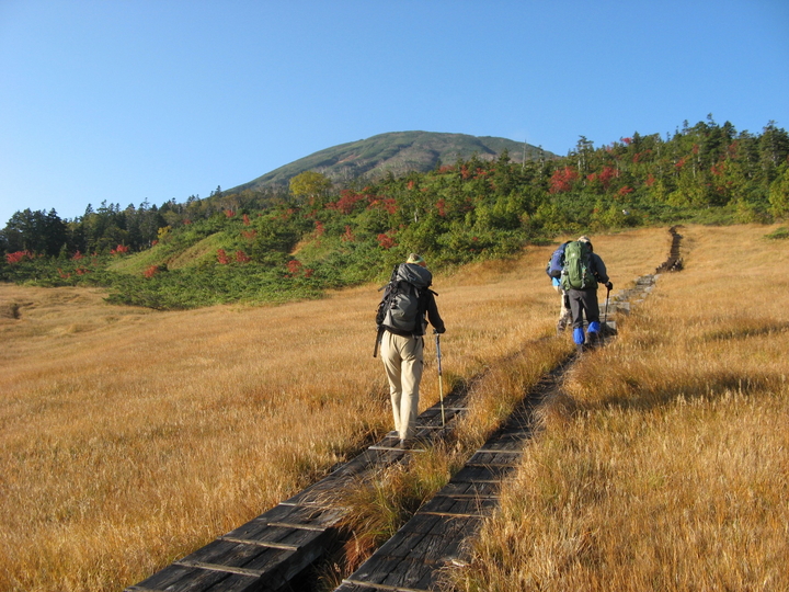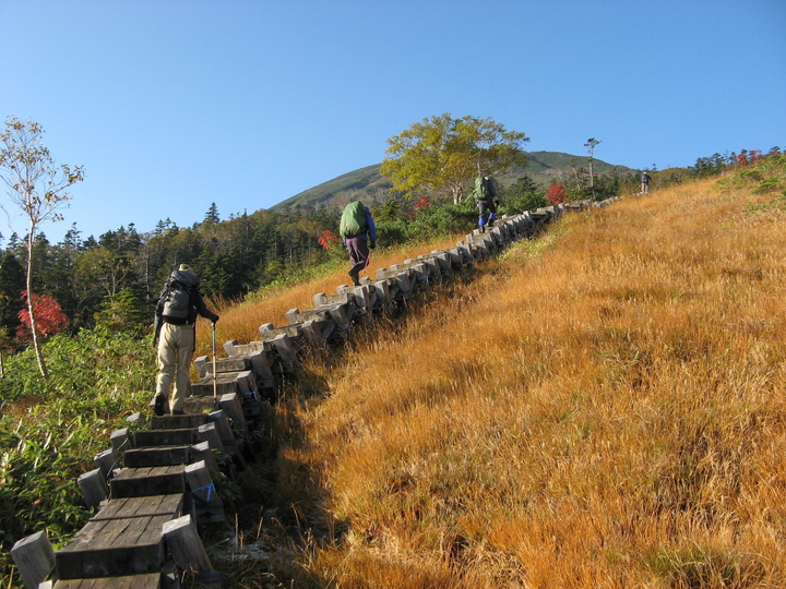 3時50分起床、まだ寝ていたいとごねる嫁を促して、予定より早く歩き出した。前夜は御池駐車場に車中泊したが、車の出入りも気にならずによく寝られた。登山道は泥んこで歩きづらく、霜が降りた木道は滑りやすくて危険だったが、前日の疲れを感じることなくよいペースで歩けた。広沢田代で見た御来光と朝陽を浴びて燃えるような草紅葉の景観は、忘れがたい印象を残すものだった。山頂は登山客でごった返しており、俎嵓と柴安嵓の間は渋滞が発生していたが、どちらの山頂も充分な広さがあり、360度の大展望を存分に楽しむことができた。