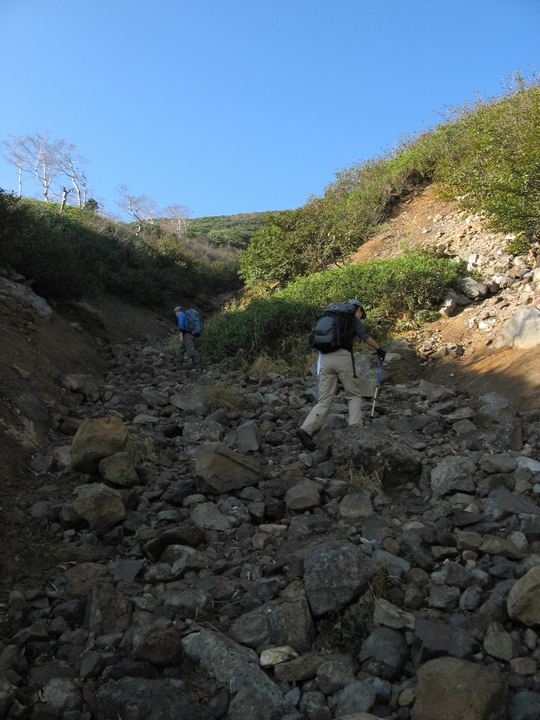 湿原の南端から樹林帯に入り、石がゴロゴロした急なガレ沢を上って行く。#