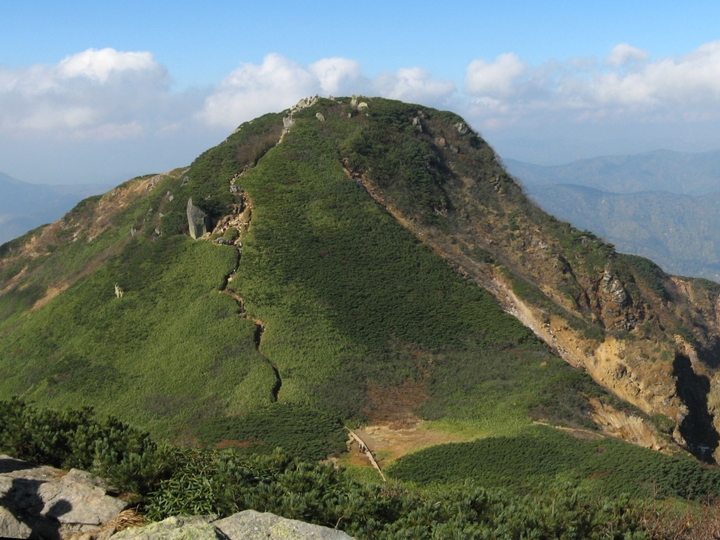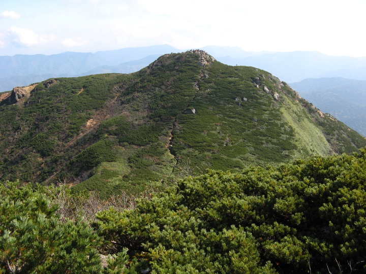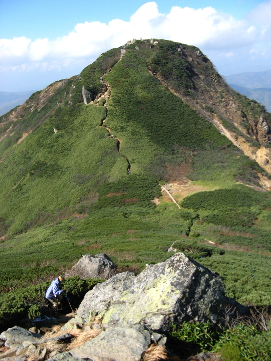 北西側の平ヶ岳。右奥に中ノ岳もうっすら見えるようになった。