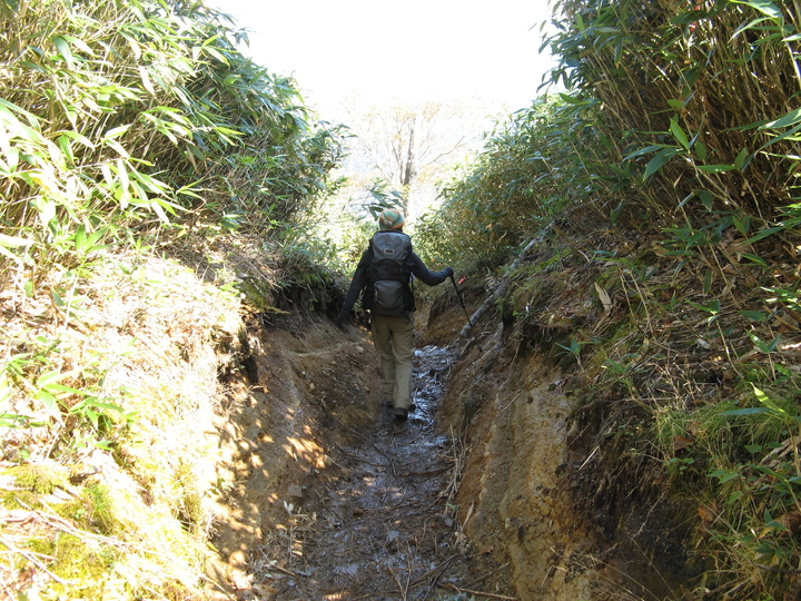 枯木の目立つ樹林帯を抜けると、山道は粘土質でドロドロのぬかるみとなった。泥水でぐちゃぐちゃの悪路が続く。泥に靴がはまらないように、足場を選んで進んだ。