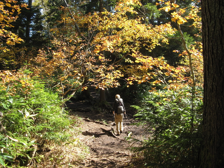 泥の悪路をひたすら下り続けると、やがて平坦な道となり、紅葉が目につくようになった。
