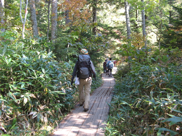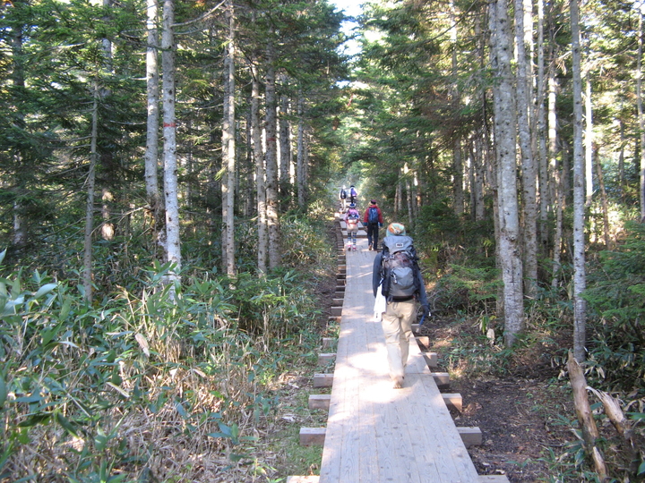 木道がない所はぬかるんで歩きづらい箇所が多かった。熊と会わないようにと祈りながら歩く。