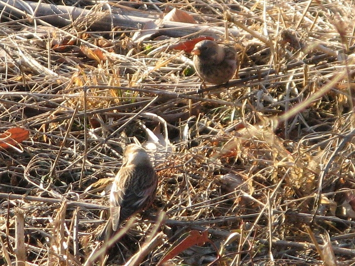 途中でベニマシコのつがいを見かけた。夢中で何かをついばんでいた。