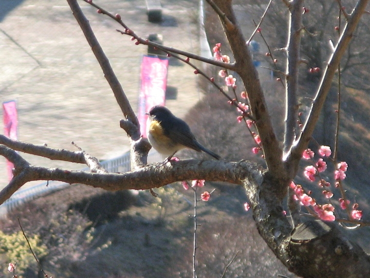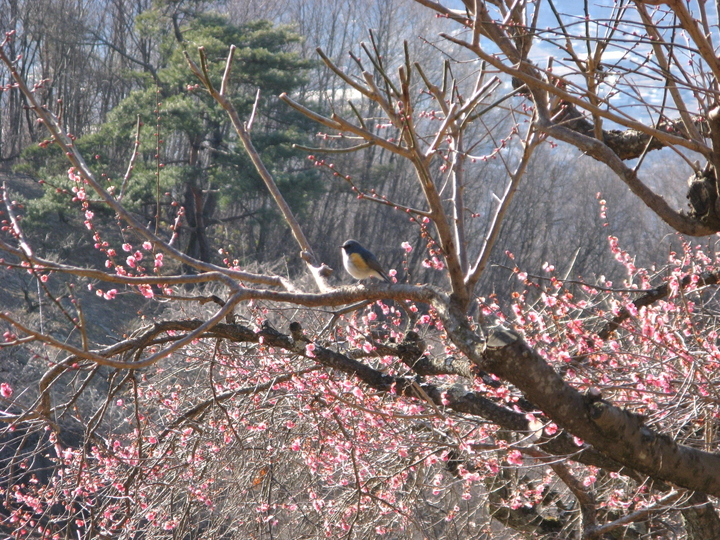 梅の木にとまったルリビタキ。