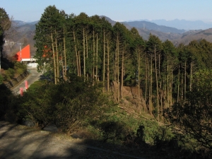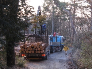 切り出した杉の丸太をトラックに載せていた。嫁はタイミングを計ってダッシュ。危険を感じたらしい。