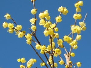 青空にロウバイの黄色が映えるので、似たような写真を何枚も撮ってしまった。