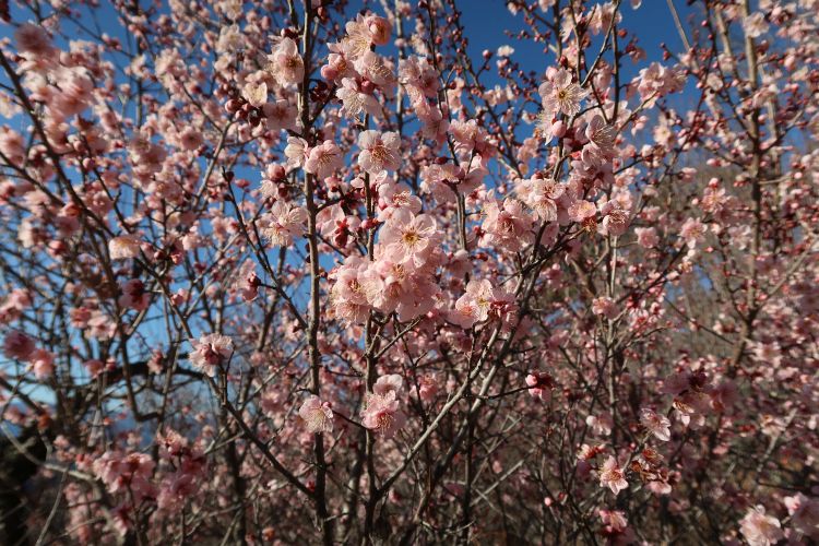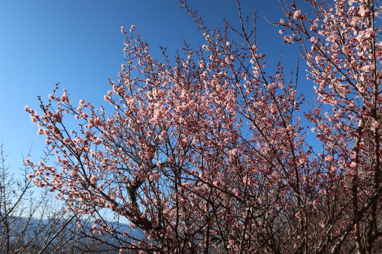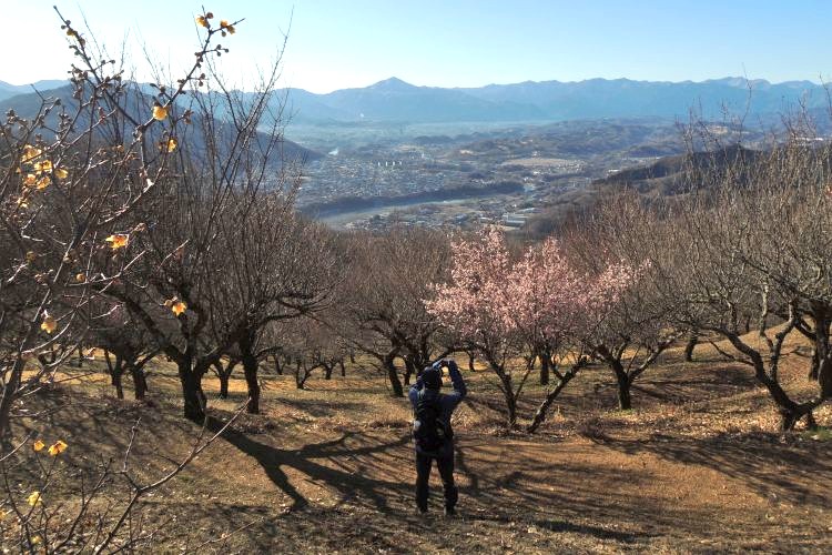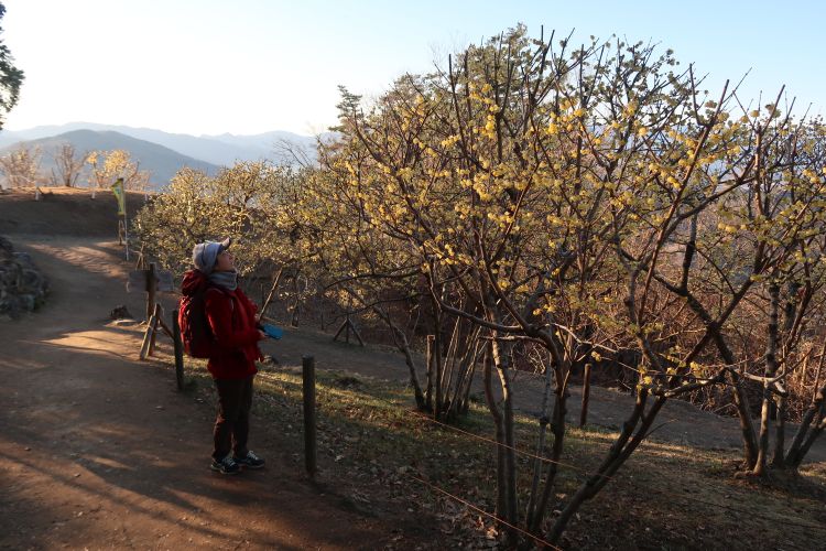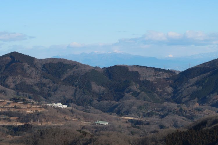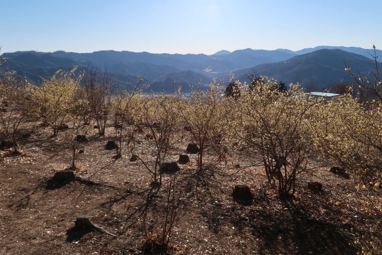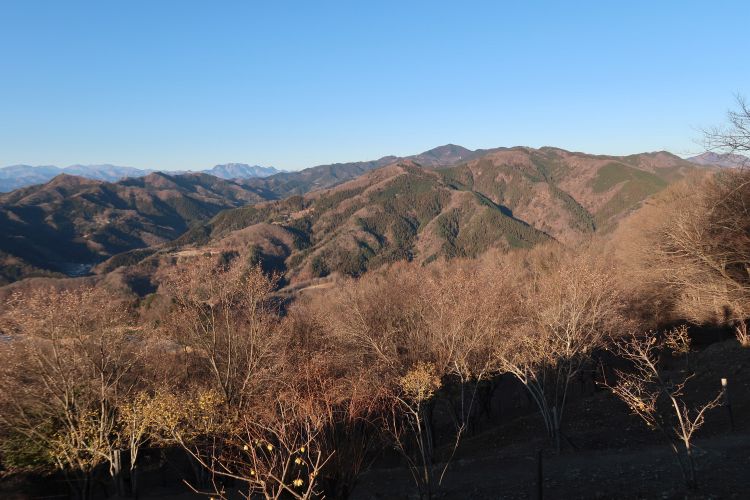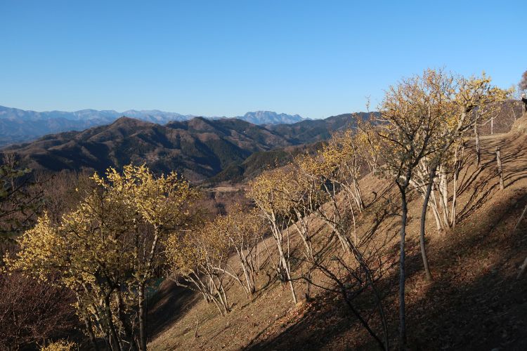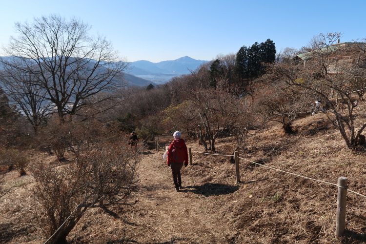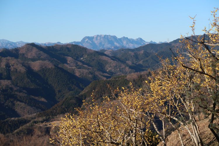東ロウバイ園へ移動。少し下には梅百花園と四季の丘がある。背後には笠山や大霧山など、奥武蔵の山々がずらりと並ぶ。