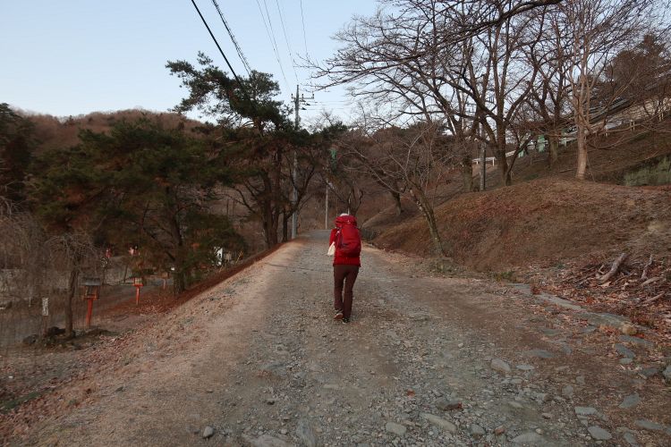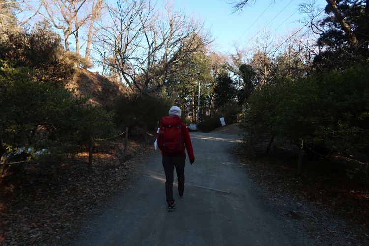 ショートカットの登山道は霜が融けて滑りやすくなっていた。