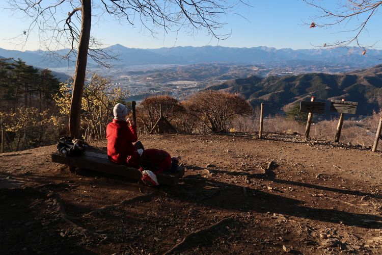 ベンチでおにぎりを食べながら、ロウバイと秩父の山並みを楽しんだ。