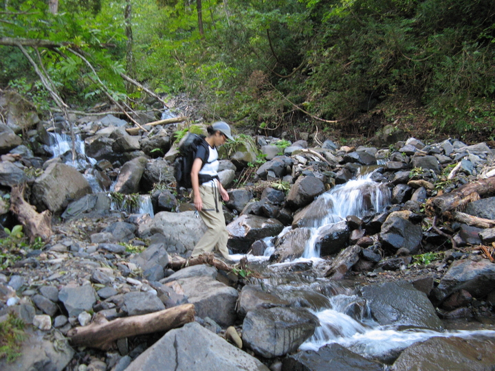 沢をいくつか渡って先へ進む。沢の音が心地よく、青空の広がりにテンションが自然と上がる。