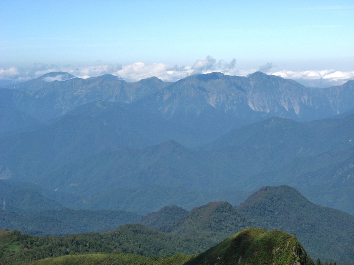 北西方面。左から武能岳、白毛門、笠ヶ岳、朝日岳、大烏帽子山と続く。