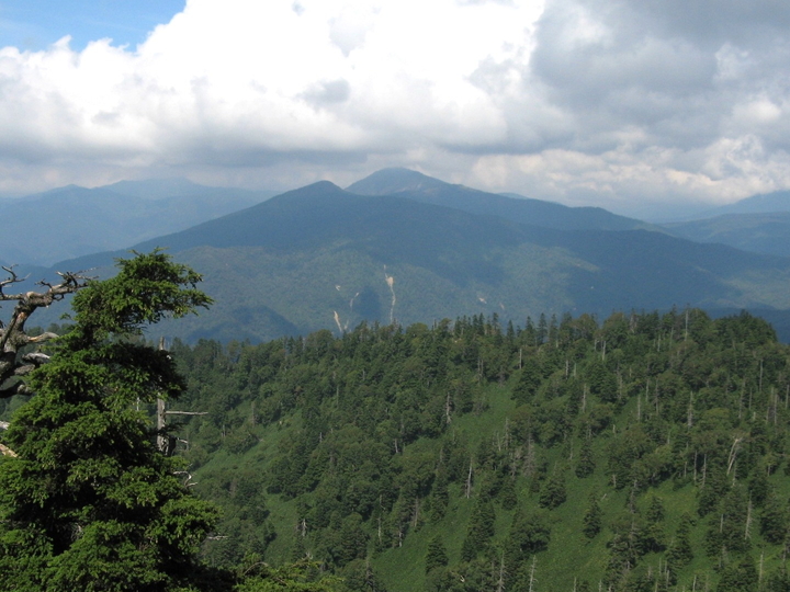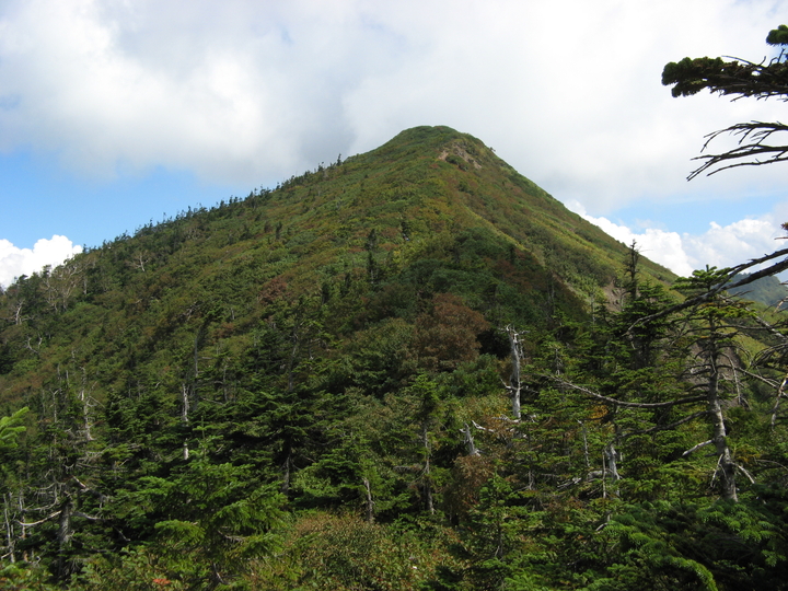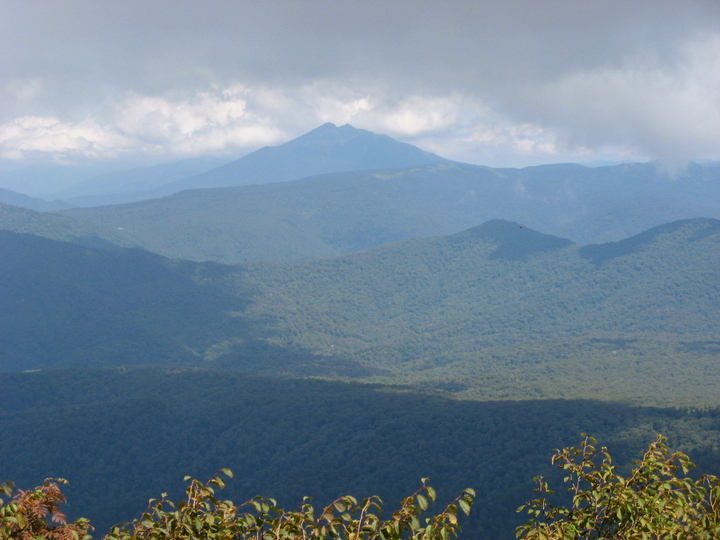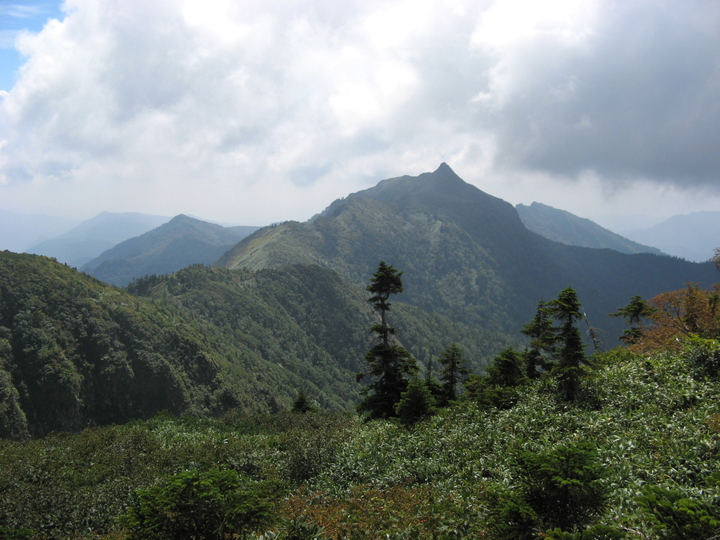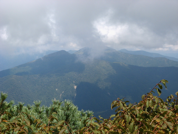 開けた場所からふと見ると、至仏山の雲がとれていた。左手前の山は笠ヶ岳と思われる。