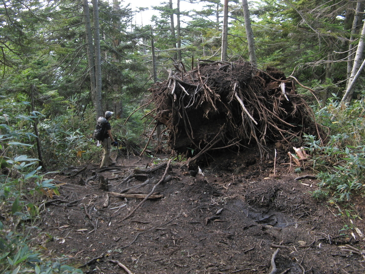 根こそぎ倒れた松の木の脇を通る。
